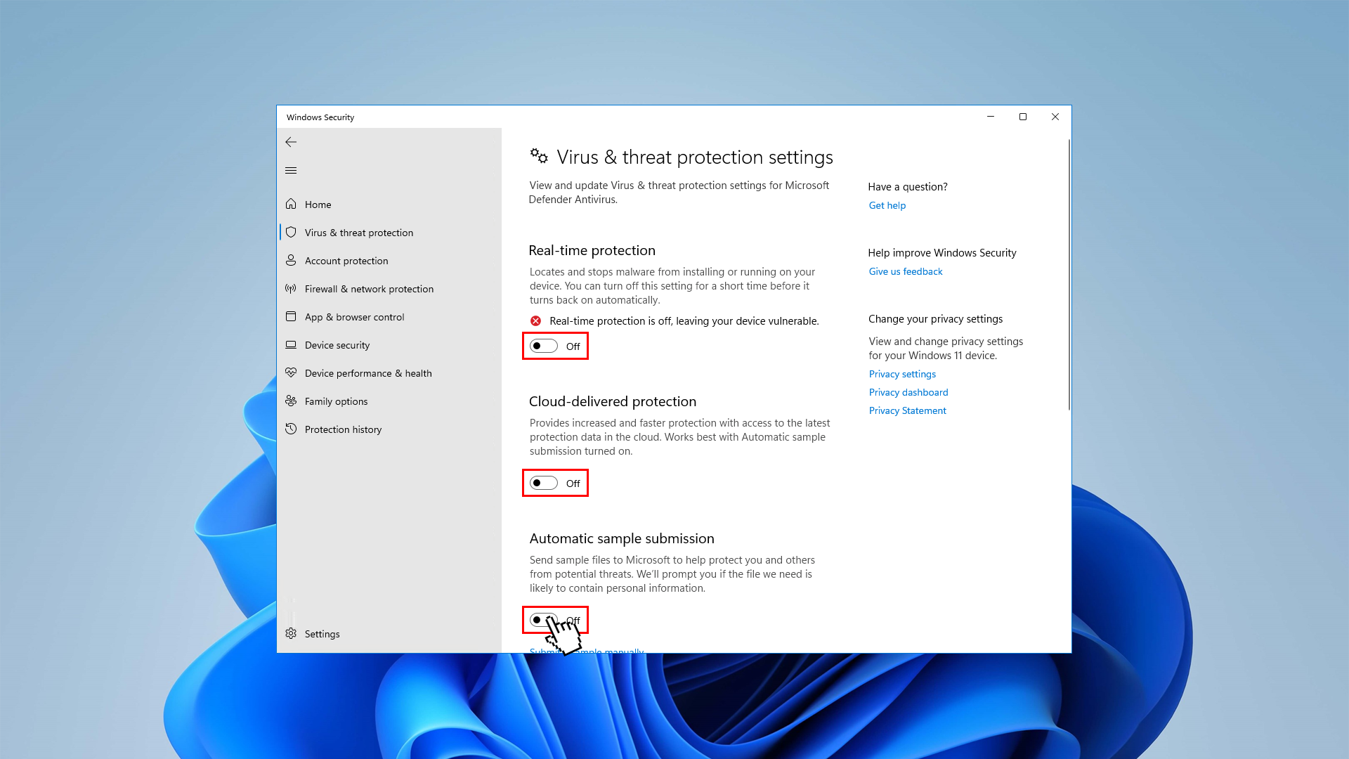 - Click on Virus and Threat Protection in the left panel of your screen.